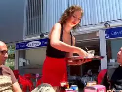 Die nortgeile dunkelhaarige Schlampe saugt im Restaurant zwei Schwänze