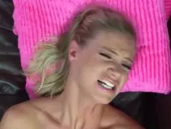Die blonde Sau massiert sich ihre aufgepumpten Euter und präsentiert sie der Kamera
